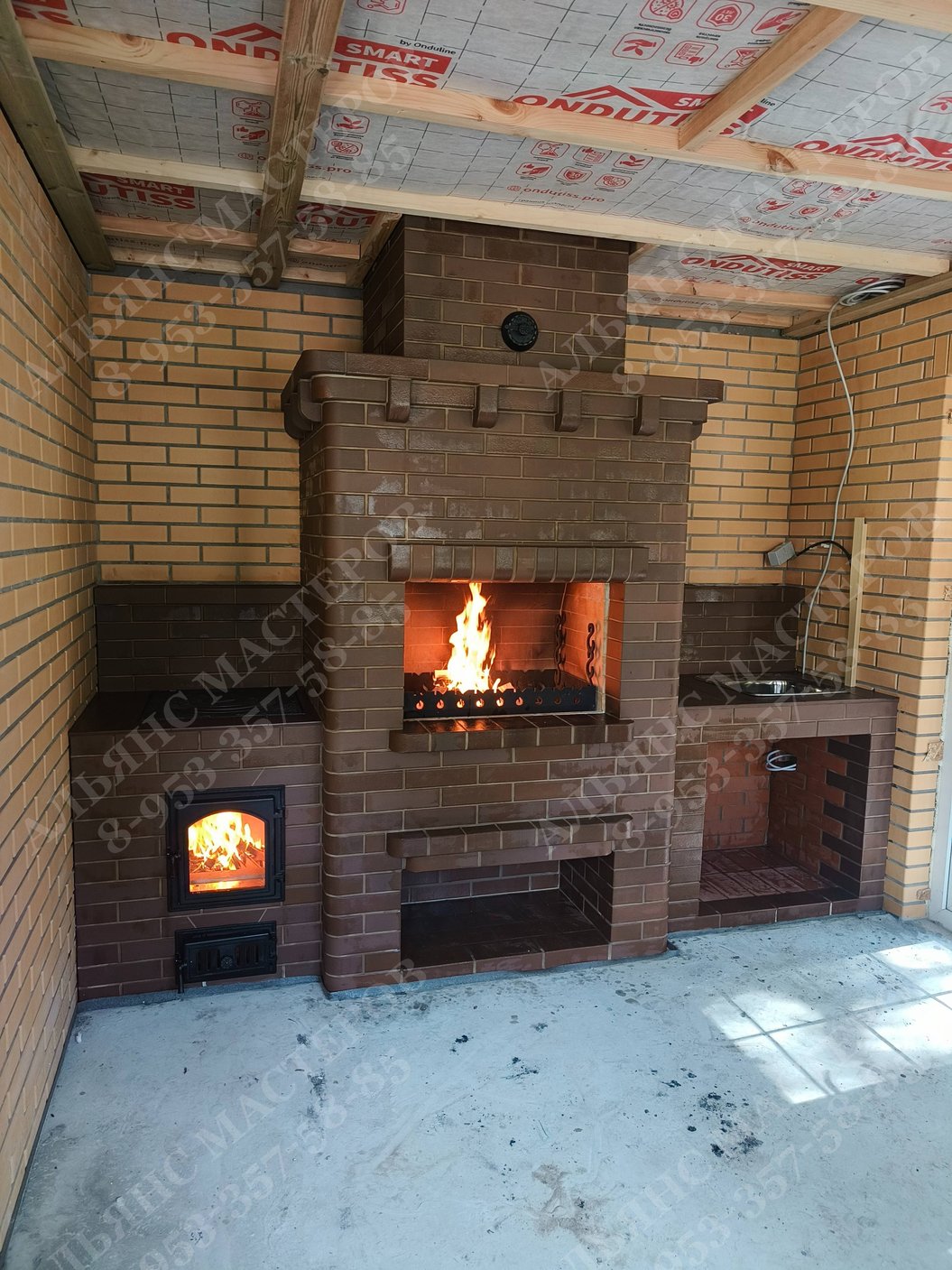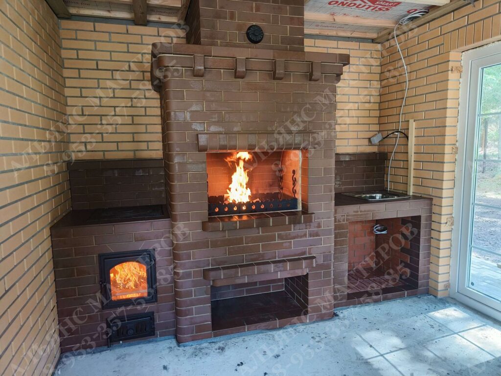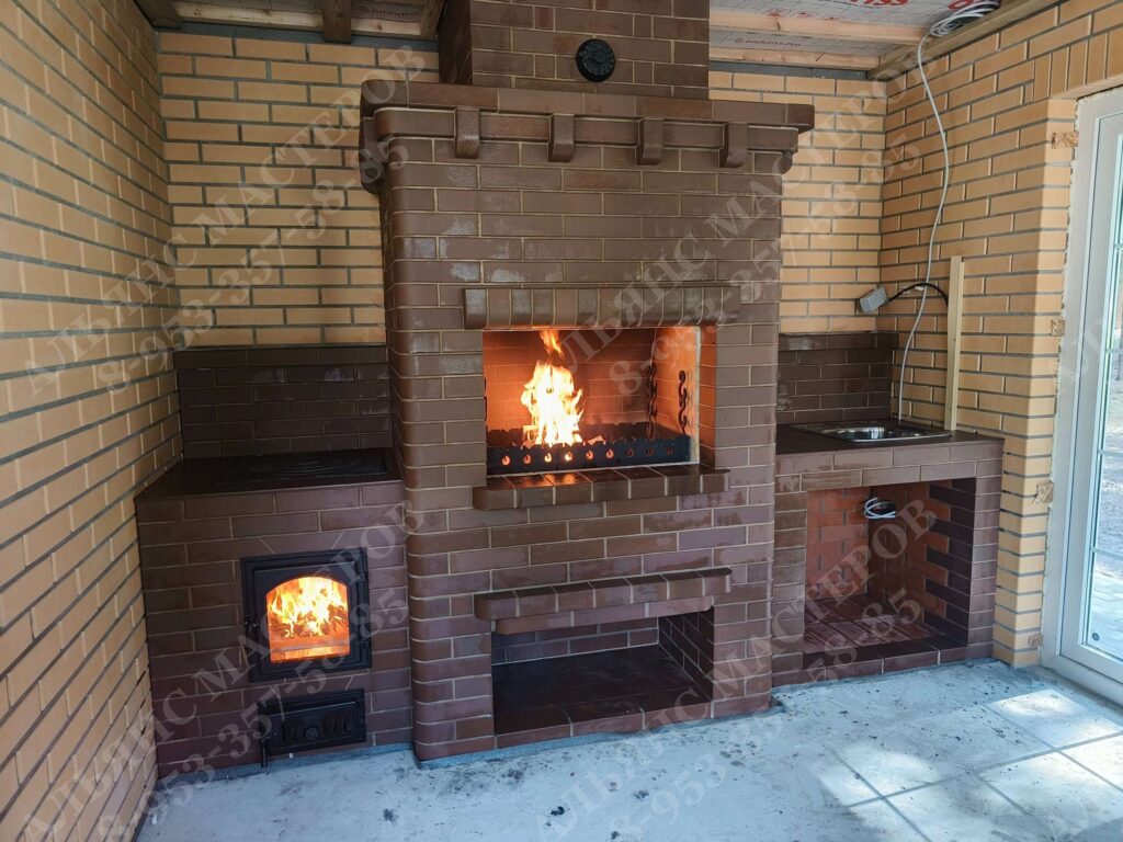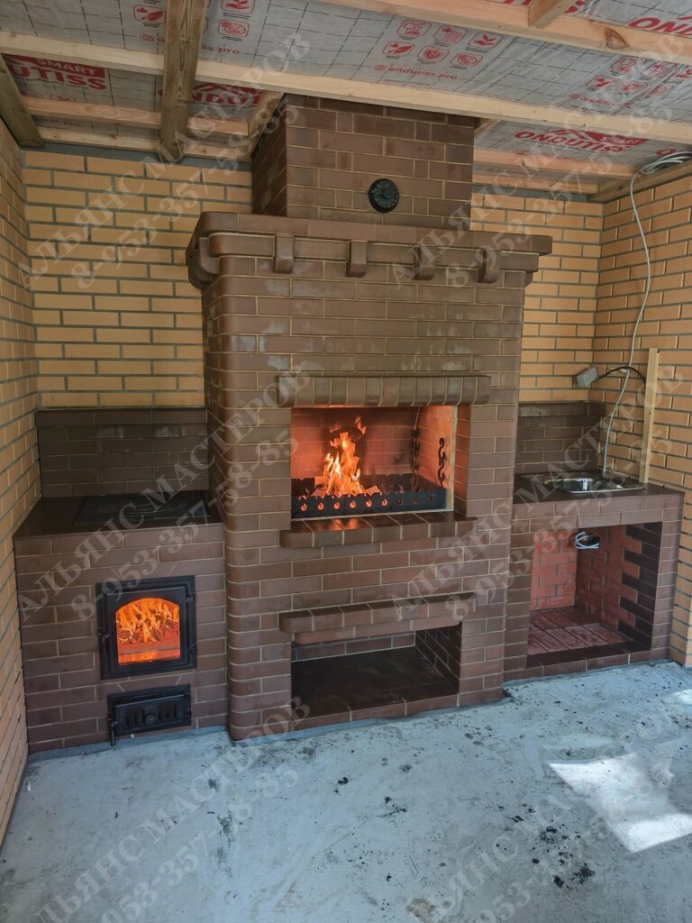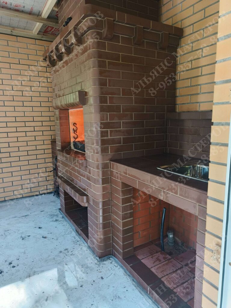Барбекю комплекс из кирпича марки КС-Керамик. Состоит из мангала и столешницы. Внутри стенки выложены из огнеупорного кирпича, а отделочный кирпич идет на внешнюю сторону. Барбекю из кирпича используется не для аккумулирования тепла, как, например, русская печь, а для приготовления на углях мяса, рыбы или других блюд. Данный комплекс позволяет одновременно приготовить большое количество разнообразных блюд. Помимо топок печной комплекс оборудован местом для угля или дров, продумано устройство системы удаления дыма и варианты решеток и вертелов. Владельцы частных домов и дач с удовольствием могут совместить наслаждение отведать вкусную, приготовленную на огне еду, с приятным времяпровождением в кругу своих близких и друзей.