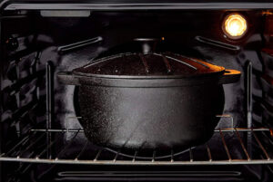 И наконец, способ, требующий минимума усилий, но не уступающий в эффективности. Единственное условие — хорошая вытяжка. После мытья и тщательной просушки поставьте казан в духовку, разогретую до 180 °C. Оставьте его там до полного прекращения дымления. Затем выключите духовку и дайте казану полностью остыть внутри.