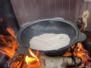 Прогревайте казан на сильном огне до тех пор, пока не перестанет идти едкий дым и запах, а внутренняя поверхность не станет равномерной. Процесс занимает 2-3 часа. Внимание: способ очень дымный, подходит только для улицы.