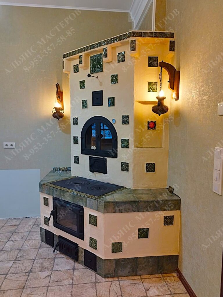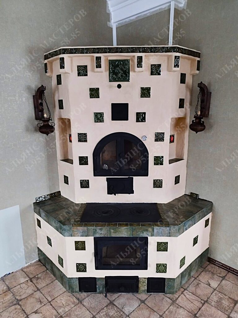 Печь внутри выложена из кирпича, облицовка штукатуркой, керамической плиткой